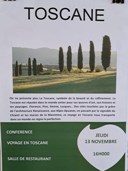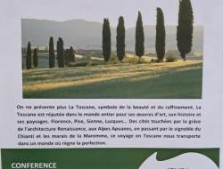 Aujourd'hui une invitation au voyage en Toscane. Magnifique région italienne riche d'histoire, de culture et d'art de vivre. Une superbe évasion pour les résidents qui apprécient toujours beaucoup les conférences de William et ses très belles photos.