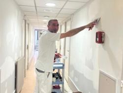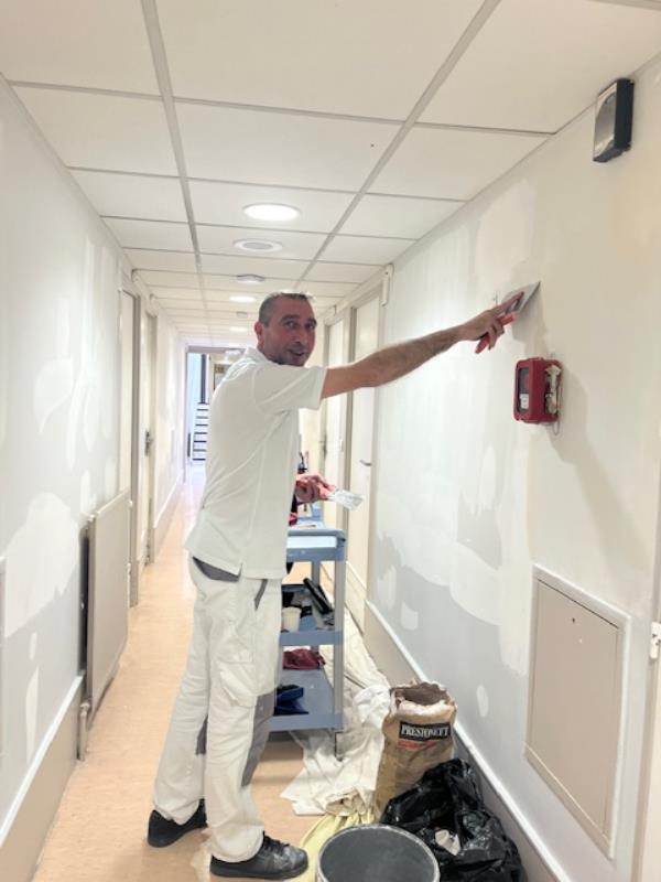 Il a commencé par les bâtiments A et C du premier étage, où il a entrepris un véritable travail de rénovation : retrait du vieux papier peint, rebouchage des fissures, ponçage et application de nouvelles couleurs, plus douces et chaleureuses. Depuis une quinzaine de jours, il s’occupe désormais du bâtiment B, toujours au premier étage.