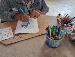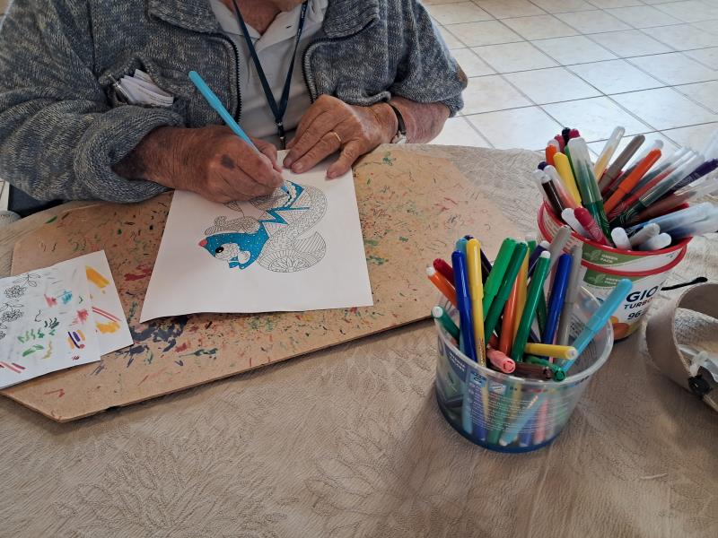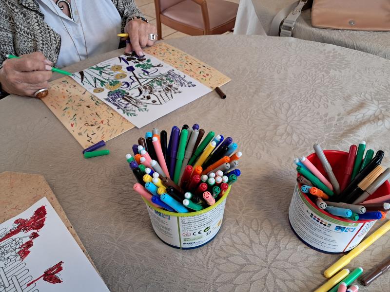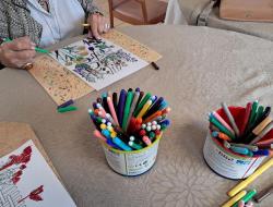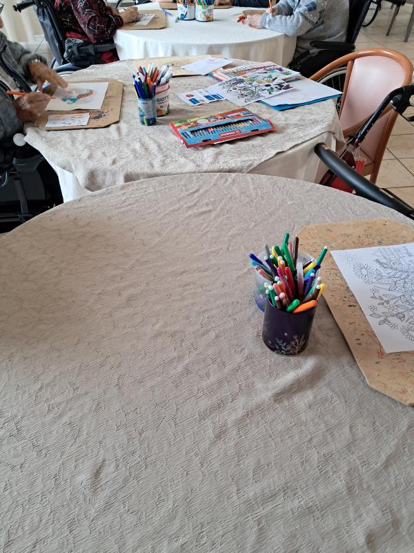Un fond de musique classique, de jolis dessins à mettre en couleurs. L'activité mandalas est un moment de détente et de concentration. Les résidents quelquefois réfractaires et qui ont fini par se joindre à l'activité reconnaissent le bienfait de ce moment. Ils ont même parfois du mal à lâcher leurs crayons.