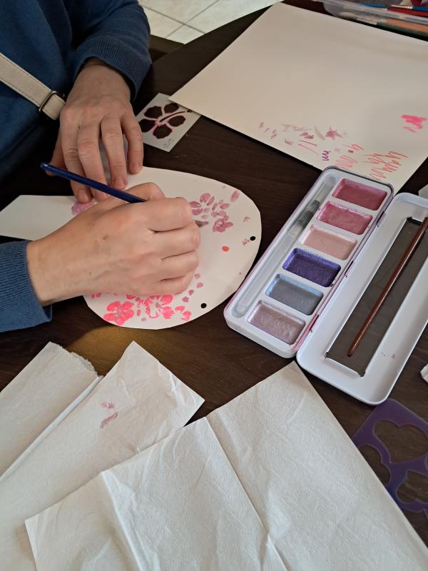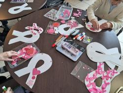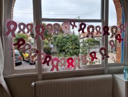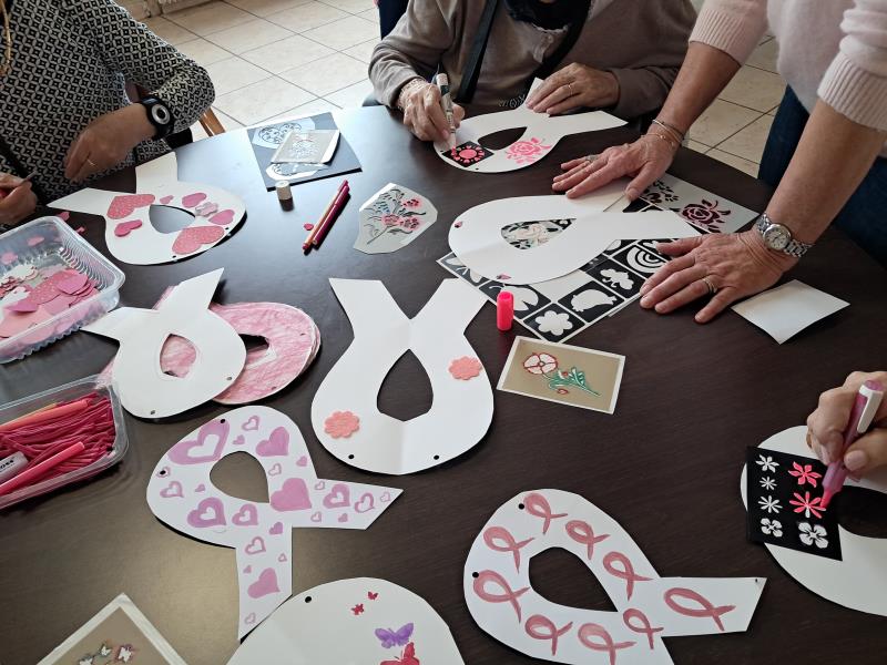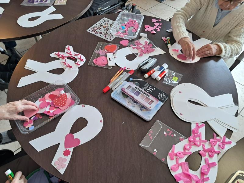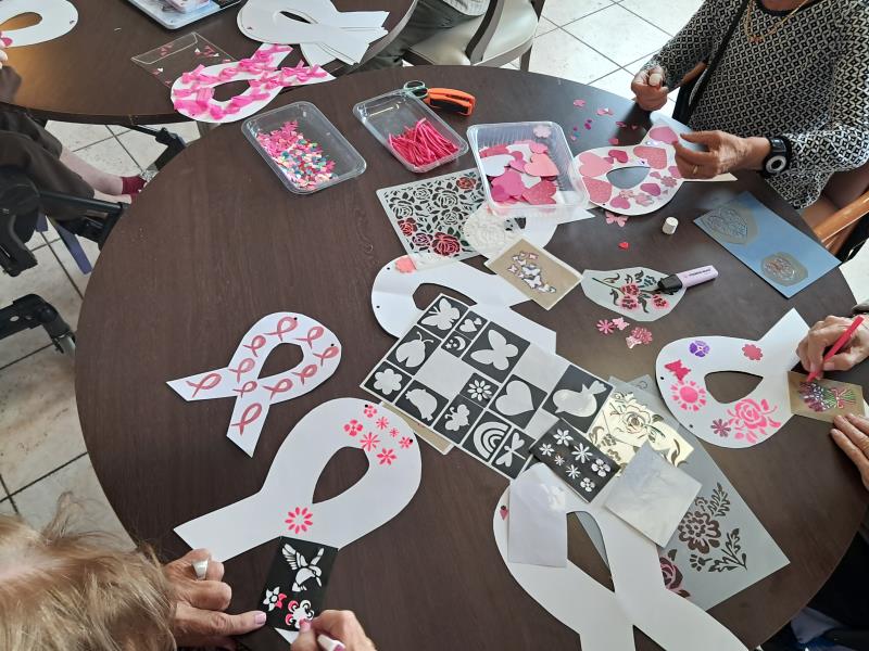 Octobre rose: création de guirlandes lors de l'atelier animé par Les blouses roses. Les résidents ont mis du coeur à l'ouvrage et fait preuve d'une belle créativité. Ces jolies guirlandes ornent désormais les fenêtres de la salle de restaurant pour le plus grand plaisir des résidents qui les trouvent très réussies